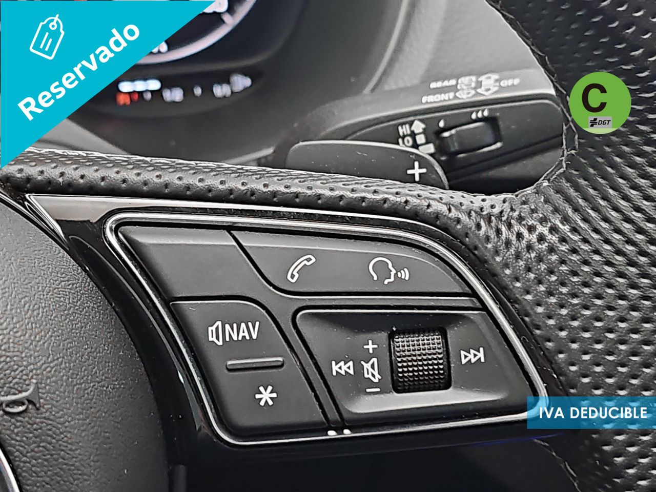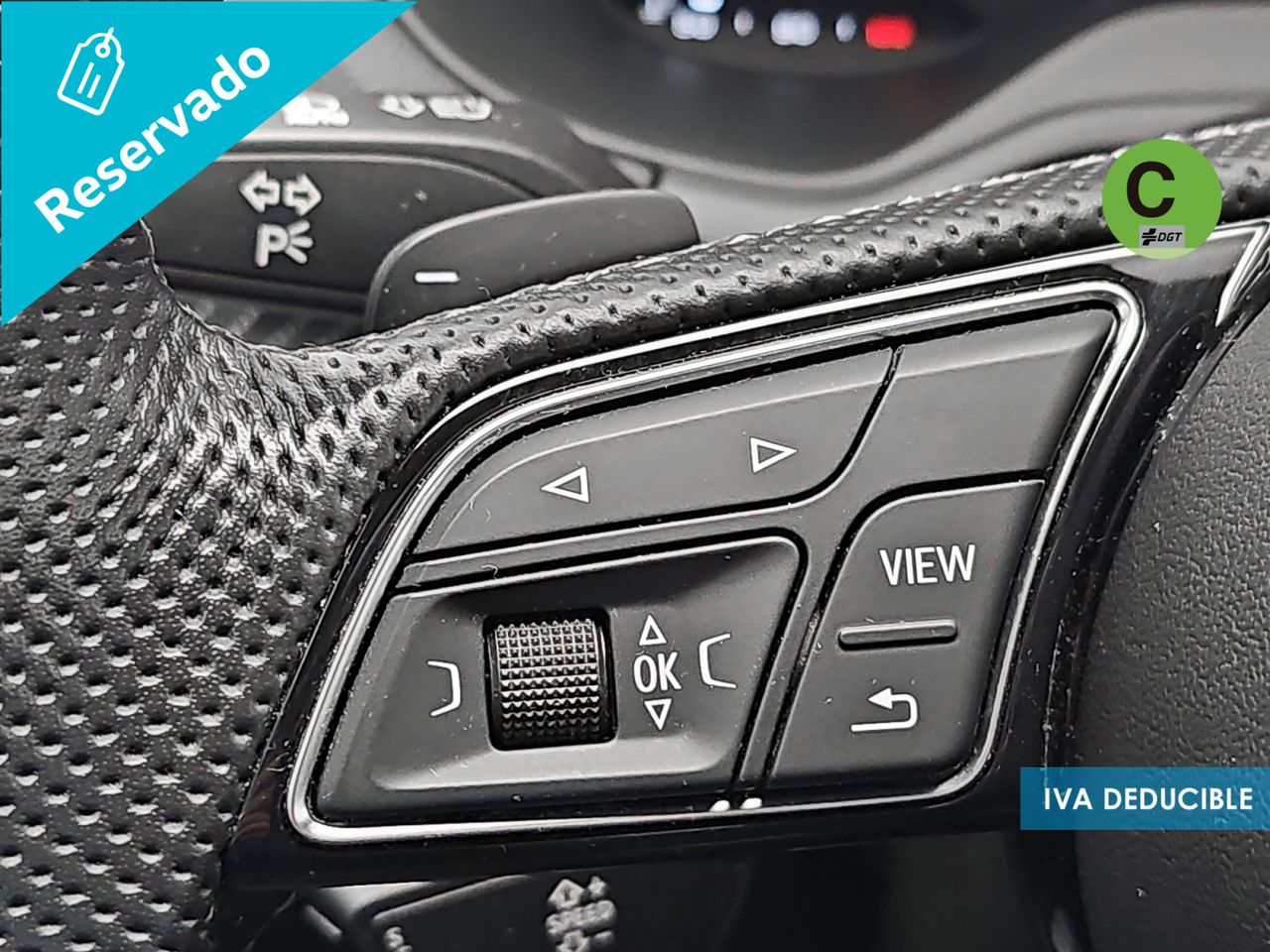 - Volante de cuero contorno deportivo, 3 radios, achatado en parte inferior, con multifunción plus y levas de cambio
